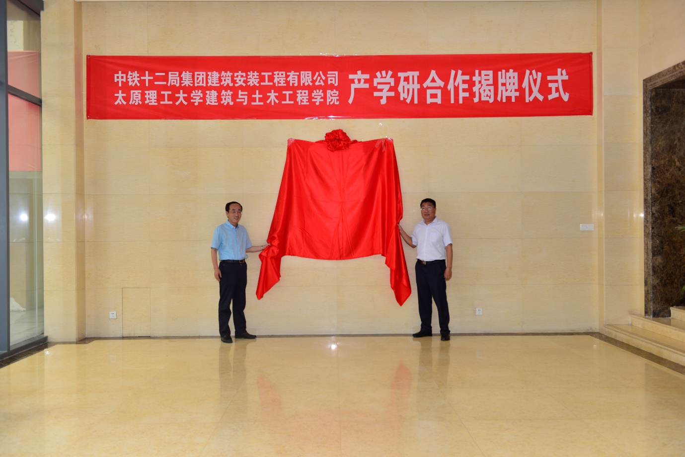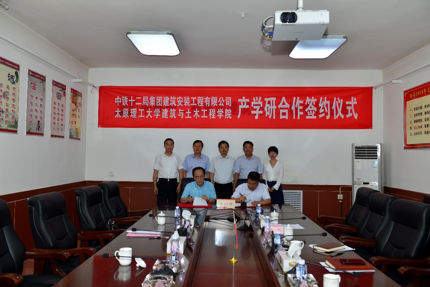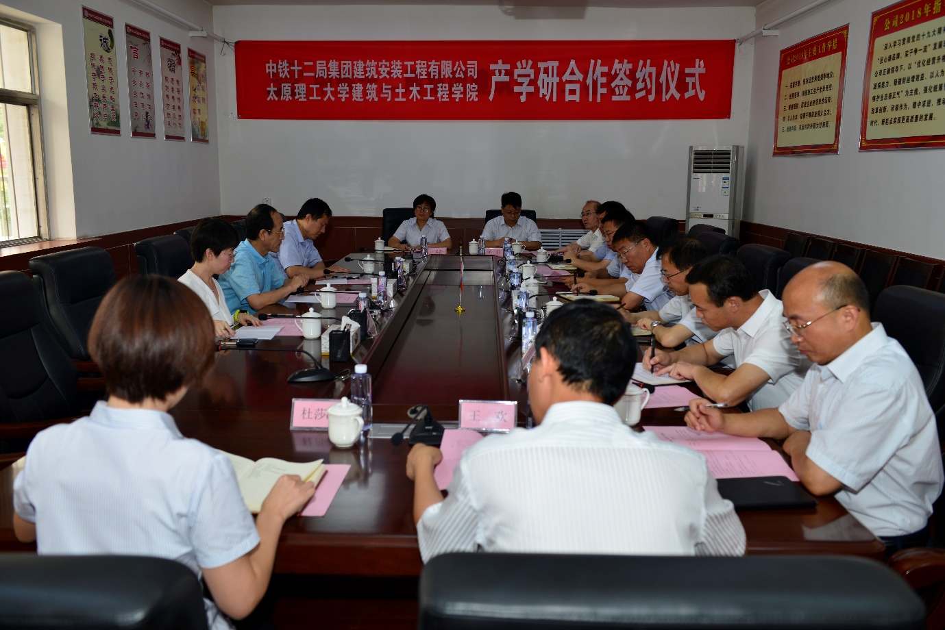 2018年7月8日上午10点,太原理工大学建筑与77779193永利官网与中铁十二局集团建筑安装工程有限公司在建安公司会议室举行产学研合作框架协议签署仪式及产学研合作揭牌仪式。建筑与土木工工程学院院长雷宏刚教授、土木系主任董晓强教授、土木实验中心主任刘元珍教授,中铁十二局集团建筑安装工程有限公司董事长、总经理蔡英康、党委书记姜振生、公司副总经理、总工程师王中军、副总经理卢会永、副总工盖宏、副总工解明旭、副总经济师李勇、科技部副部长范伟、科技部副部长王美静、测试中心副主任王欢、科技部部员杜莎莎出席了签约及揭牌仪式。