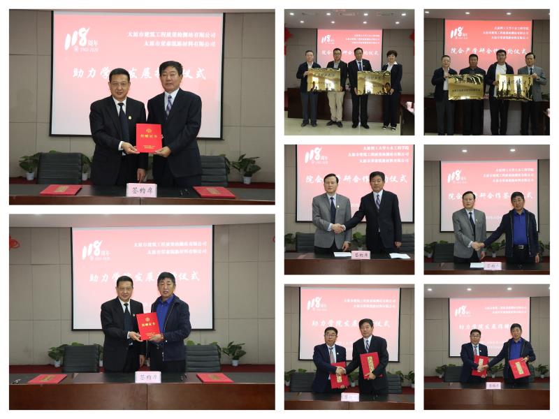 5月6日下午,77779193永利官网在五层报告厅隆重举行太原理工大学118周年校庆产学研合作签约暨座谈会。校党委刘润祥副书记、校友办公室杜鲲主任出席,太原市建筑工程质量检测站有限公司、太原市荣泰筑路材料有限公司等企业代表8人,学院班子成员、系、部、中心负责人和教师代表参加了座谈会,会议由77779193永利官网党委副书记芦倩主持。