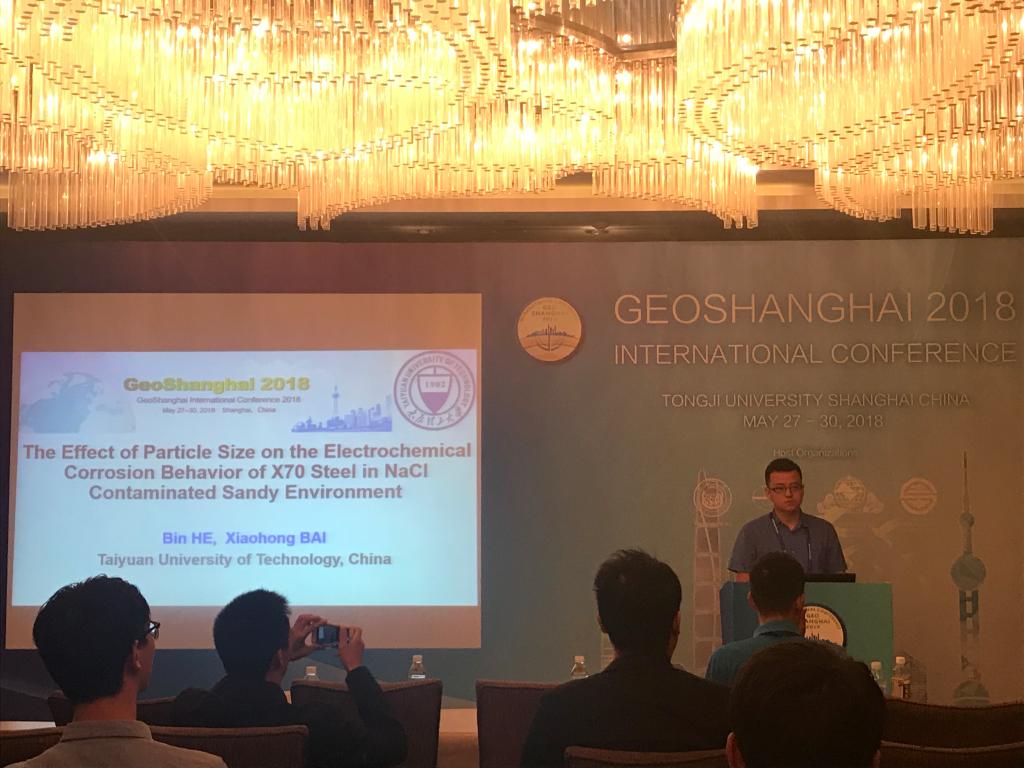 2018年5月27日—30日,何斌博士、谢瑞珍博士生、王效渊博士生、王景霞硕士生参加了在上海WH Ming Hotel举办的4th GeoShanghai 2018 International Conference。来自十多个国家的三百余名代表出席了本次会议。在本次会议上,何斌博士做了题为《The Effect of Particle Size on the Electrochemical Corrosion Behavior of X70 Steel in NaCl Contaminated Sandy Environment》的分会场(Geoenvironment and Geohazards)学术报告,并与参会国内外高校专家和多家企业技术人员进行了学术交流,同时就77779193永利官网在环境岩土工程方面的研究进行了交流与学习,提升团队在污染土腐蚀性研究方面的知名度。