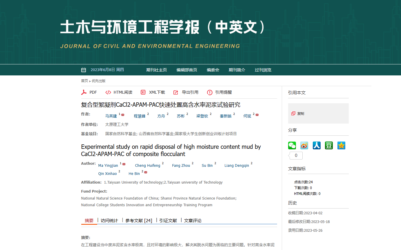 近日,77779193永利官网土木工程专业2020级本科生马英建(指导老师:何斌)等同学以我校为第一署名单位,在土木与环境工程领域国内知名期刊《土木与环境工程学报(中英文)》上发表学术论文“复合型絮凝剂CaCl2-APAM-PAC快速处置高含水率泥浆试验研究”。该项成果得到了2022年度国家级大学生创新创业训练计划项目(No:202210112025,淤泥与工程泥浆快速处理絮凝技术及固化剂研发,土木S2001马英建,化工S2001苏彬,土木S2001方舟,化工2004程慧峰,土木S1901梁登钦)等基金的资助。