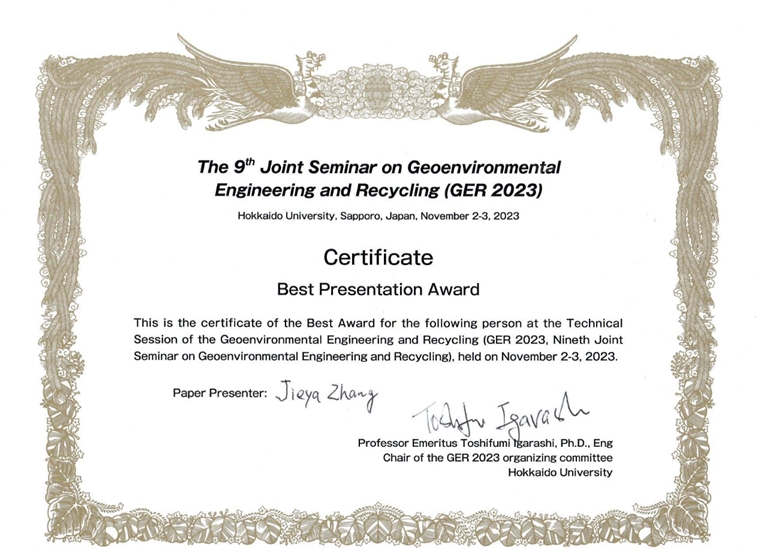 学术报告闭幕式上,大会学术委员会经投票评选出了研究生最佳报告奖,张洁雅喜获殊荣。同时,大会宣布由我校承办第十届环境岩土工程与循环利用国际研讨会,董晓强介绍了校院的基本情况和学科发展现状,向大会组委会的信任表示了感谢,诚挚邀请大家2024年相聚太原理工大学。