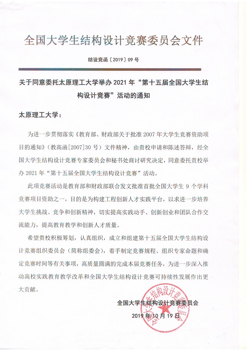“全国大学生结构设计竞赛”发起于2005年,由中国高等教育学会工程教育专业委员会、高等学校土木工程学科专业指导委员会、中国土木工程学会教育工作委员会、教育部科学技术委员会环境与土木水利学部共同主办,是教育部和财政部联合发文(教高函[2007]30号)批准的9个首批全国大学生学科竞赛项目资助之一,是首批列入教育部高校学科竞赛排行榜的18项竞赛之一,是目前土木工程领域级别最高、规模最大的学生创新竞赛。