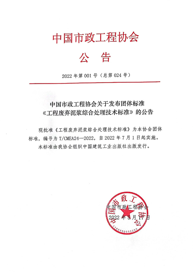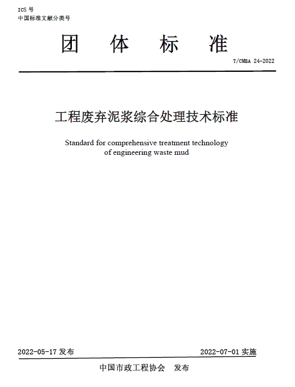 为推动上下游产业链的融合创新,促进新技术、新产品的应用,提高我国废弃泥浆的综合利用水平,经中国市政工程协会批准,由中建工程产业技术研究院有限公司、中建安装集团有限公司、台州市鼎正再生资源回收有限公司、太原理工大学、中建三局集团(深圳)有限公司、深圳大学、浙江大学、中水电四局南方(珠海)工程有限公司、中国建设计研究院有限公司等单位编制团体标准-《工程废弃泥浆综合处理技术标准》。