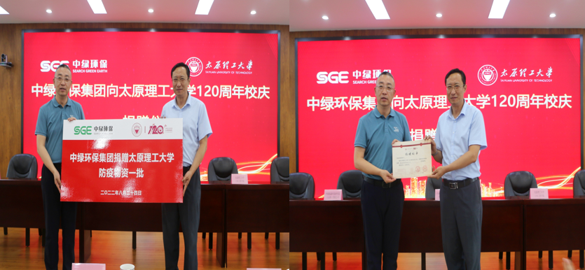 仪式上,中绿环保集团向太原理工大学捐赠了一批防疫物资感应式泡沫洗手机,周伟向中绿环保集团颁发捐赠证书。