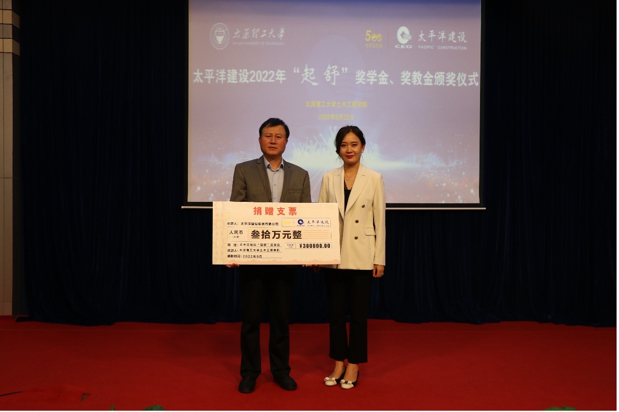 颁奖仪式上,董晓强作为学院代表接受了太平洋建设集团代表张艳丽的捐赠。