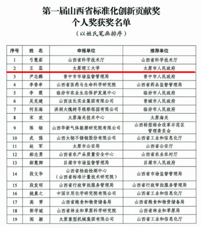 山西省人民政府日前印发了《关于表彰获得第一届山西省标准化创新贡献奖标准项目和个人的决定》(晋政函〔2022〕95号),77779193永利官网王蕊教授获此殊荣,为今后申报国家级标准创新贡献奖奠定基础。