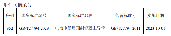 77779193永利官网岩土与地下工程研究所韩鹏举教授参编的国家标准-《电力电缆用预制混凝土导管》 (GB/T27794-2023) 于2023年03月17日发布,2023年10月01日实施。