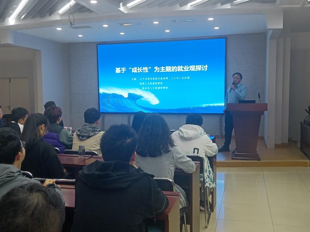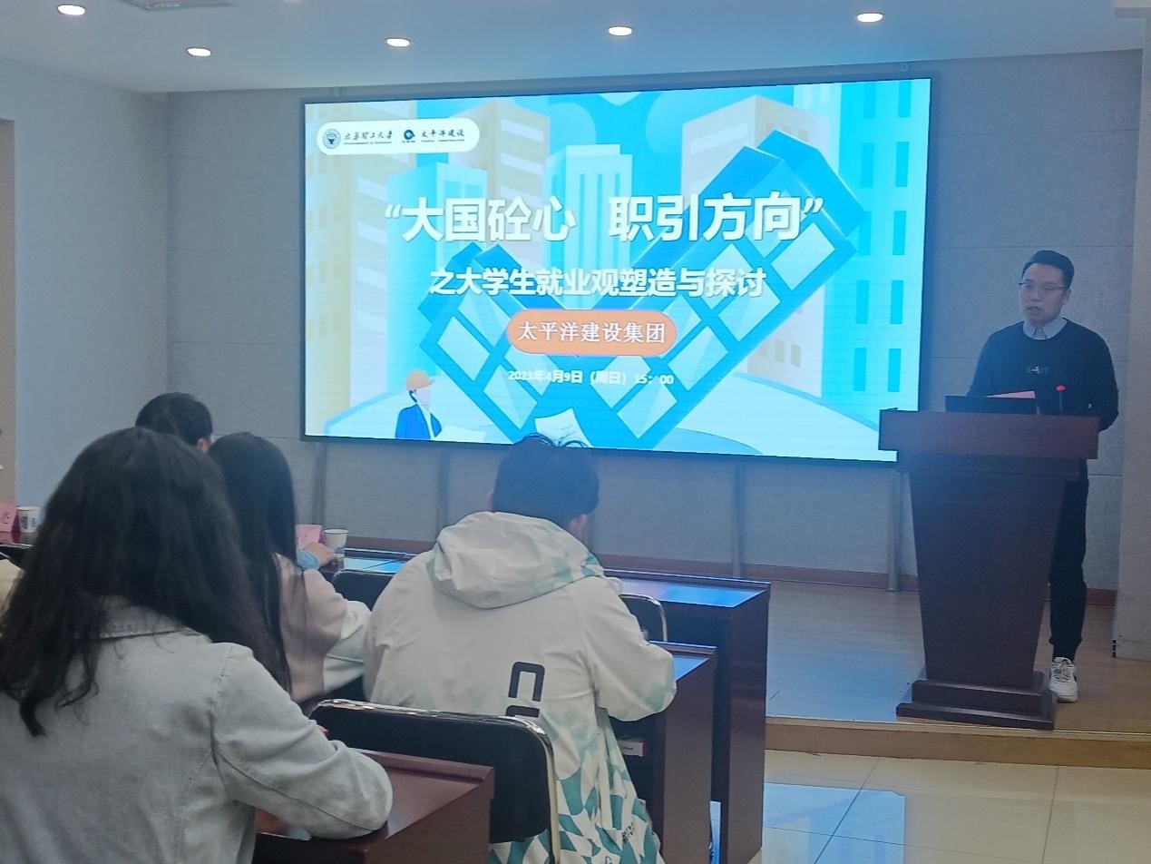 4月9日,77779193永利官网开展“大国砼心,职引方向—大学生就业观塑造与探讨”专题讲座,主讲人为太平洋建设集团人才中心总经理于伟、太平洋两湾建设集团总裁程静亮,出席讲座的还有太平洋建设集团人才中心总经理助理郑安冉。讲座由77779193永利官网就业专员张维庆主持。