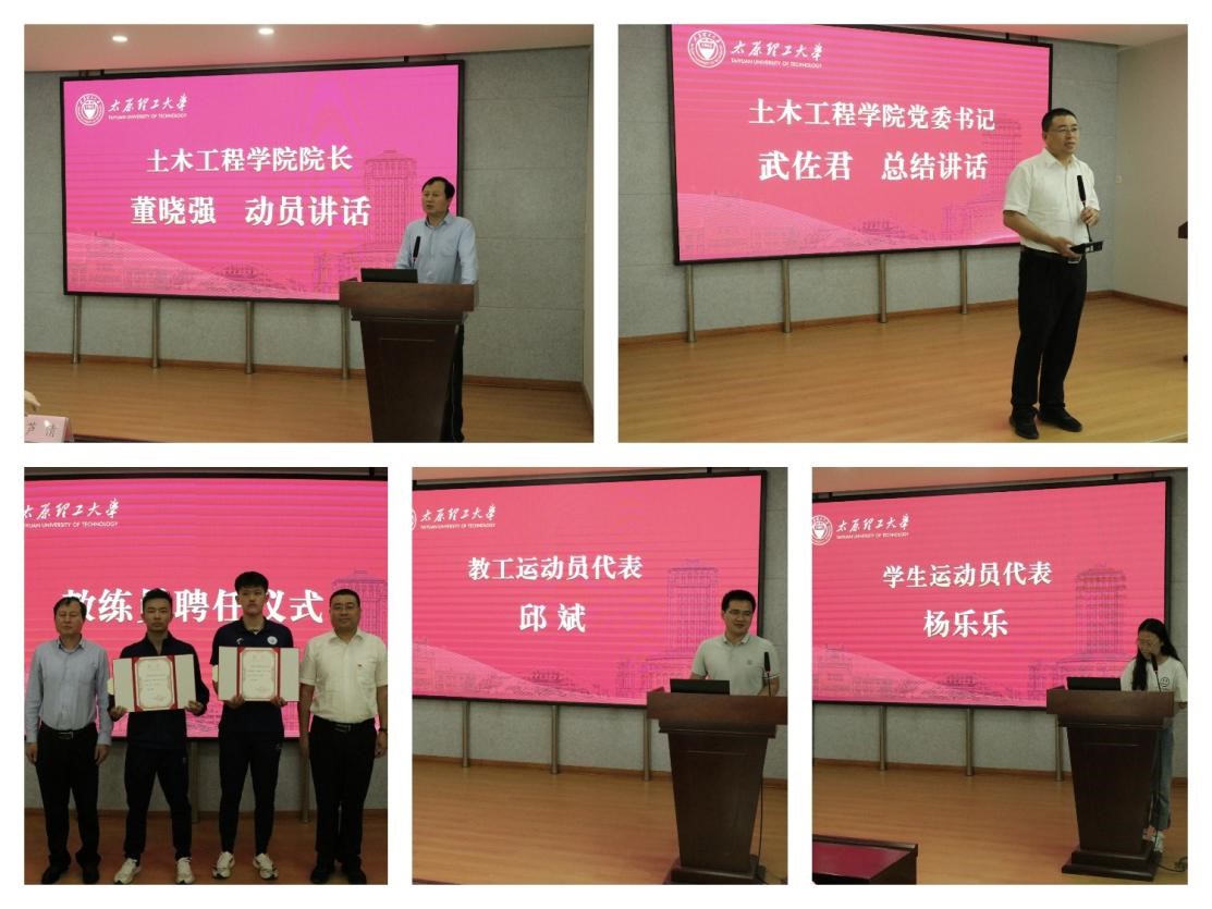 然后,武佐君书记和董晓强院长为两位教练代表颁发聘书。邱斌老师代表全体教工运动员发言,表示会竭尽所能,奋勇向前,谱写为建筑生命负责的时代篇章。土木1905班杨乐乐同学代表全体学生运动员发言,感谢学院的支持和教练员的指导,她表示,作为学生运动员一定会拼尽全力,在赛场上展示出土木学子的风采。