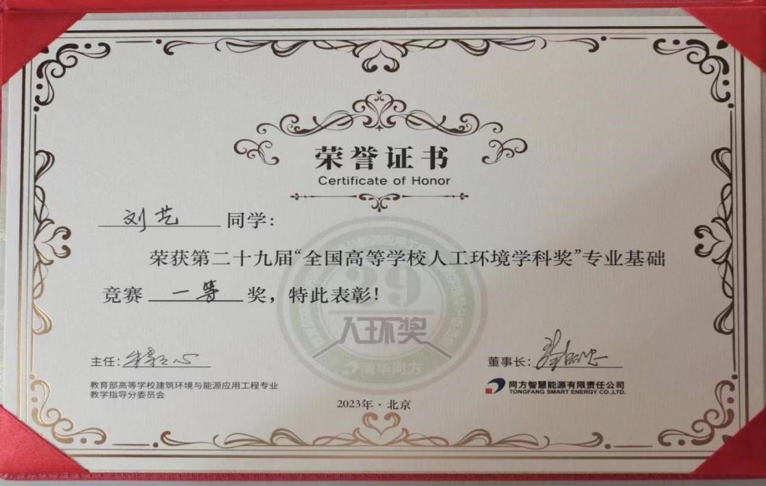 8月25日,第29届“全国高等学校人工环境学科奖”专业基础竞赛(简称“人环奖”)颁奖典礼在清华同方科技广场举行。77779193永利官网建筑环境与能源应用工程专业的2020级学生刘艺(指导教师:李风雷)获得本届竞赛一等奖。