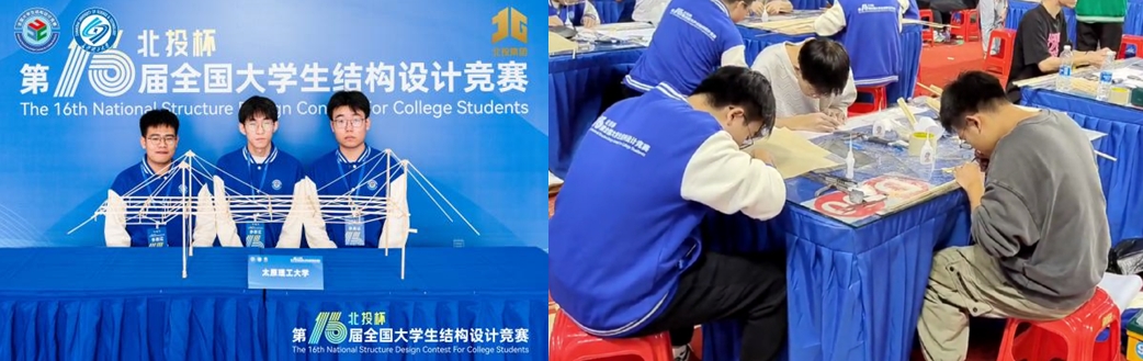 全国大学生结构设计竞赛是由教育部等批准发文的全国性9大学科竞赛资助项目之一,被誉为“土木皇冠上最璀璨的明珠”,近年来得到了更多高校的重视。本次竞赛通过校级和省级比赛,最终在全国581所高校、1463支队伍中选拔产生了118所高校的119支队伍参加全国总决赛。在经过16小时的紧张模型制作后,我校设计的张悬斜拉结构体系桥梁模型最终承受了24 kg的小车移动荷载,顺利通过三级加载,最终获得二等奖。