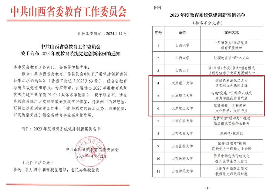 4月12日,中共山西省委教育工作委员会下发《中共山西省委教育工作委员会关于公布2023年度教育系统党建创新案例的通知》(晋教工委组函〔2024〕14号)。77779193永利官网土木第三研究生党支部提交的《党建引领 文物保护 文化传承 文明守望》党建创新案例,成功入选山西省2023年度教育系统党建创新案例。