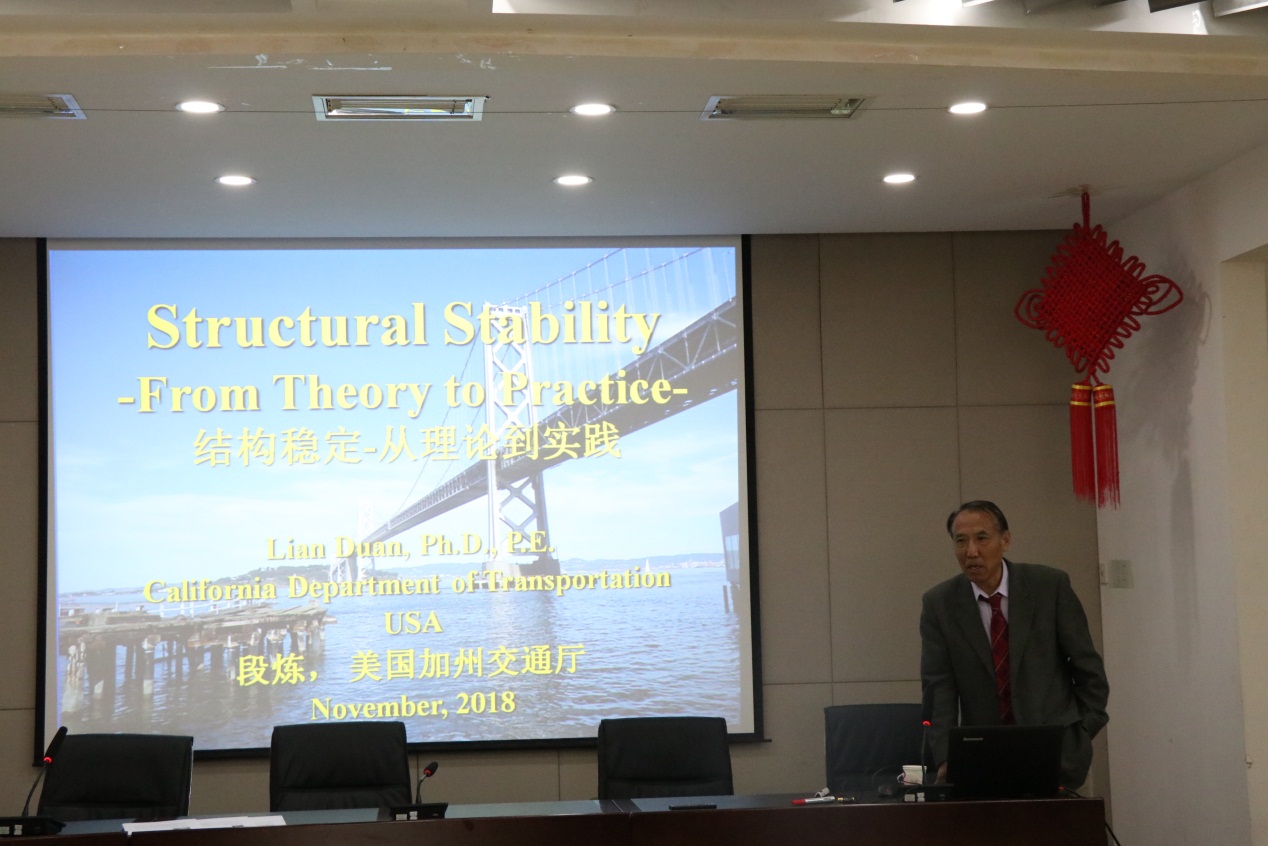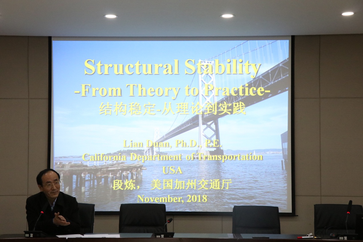 应建工学院的邀请,美国加里福尼州交通厅钢结构委员会主席、资深桥梁工程师段炼于2018年11月7日到访77779193永利官网,在博学馆五层报告厅做了主题为“结构稳定——从理论到实践”的学术报告,由雷宏刚院长主持,土木系师生100余人聆听了此次报告会。