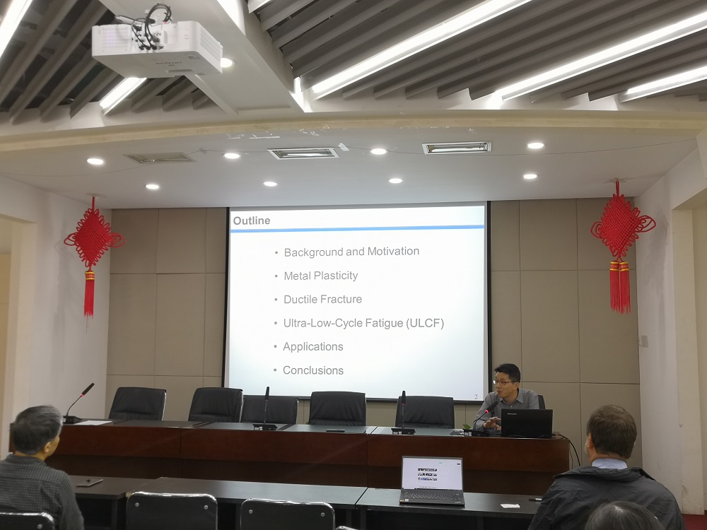 贾教授详细介绍了超低周循环加载和细观断裂模型等概念,解释了金属塑性变形和延性裂纹拓展引起的破坏机理及相关试验方法、细观断裂模型确定等。此外,贾教授还就目前的断裂模拟方面研究成果及金属断裂阻尼器和支撑在实际工程中的应用做了概述。