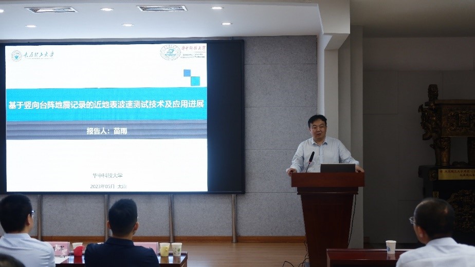 华中科技大学苗雨教授以《基于竖向台阵地震记录的近地表波速测试技术及应用进展》为题,讲述了利用物理学中的干涉测量方法,基于竖向台阵地震记录的高精度原位剪切波速测试技术,用于研究多环境因素影响下近地表剪切波速的变化规律和非线性性质。报告精彩深刻,对在场师生们的科研思维产生了重要的引领作用。