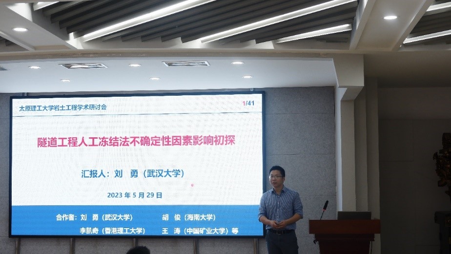 武汉大学刘勇教授以《隧道工程人工冻结法不确定性因素影响研究》为题进行学术报告,首先介绍了人工冻结法在隧道工程中的应用,重点讲述了人工冻结法的三类主要不确定性因素,随即基于人工冻结法有限元模型,进行隧洞尺度下的冻结效果讨论。整场报告深入浅出,图文并茂,与会师生表现出浓厚兴趣。
