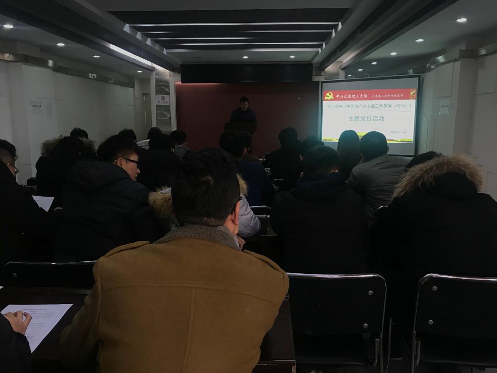 为了进一步学习宣传贯彻《中国共产党支部工作条例(试行)》,2018年12月13日,土木第三研究生党支部开展《中国共产党支部工作条例(试行)》(以下简称《条例》)专题学习的主题党日活动,努力推动《条例》的宣传与落实。本次活动由支部书记何斌同志主持,共有 25 名同志参加,其中正式党员 19 名,预备党员2名,积极分子4 名。
