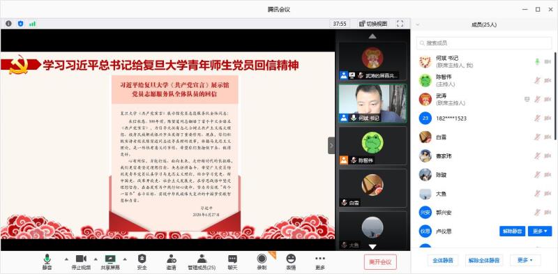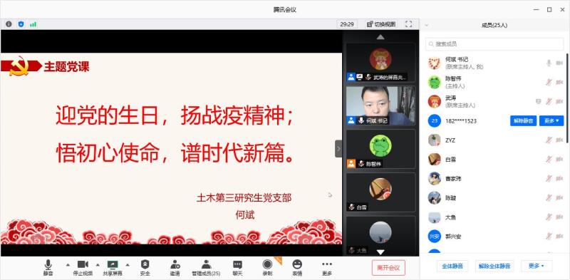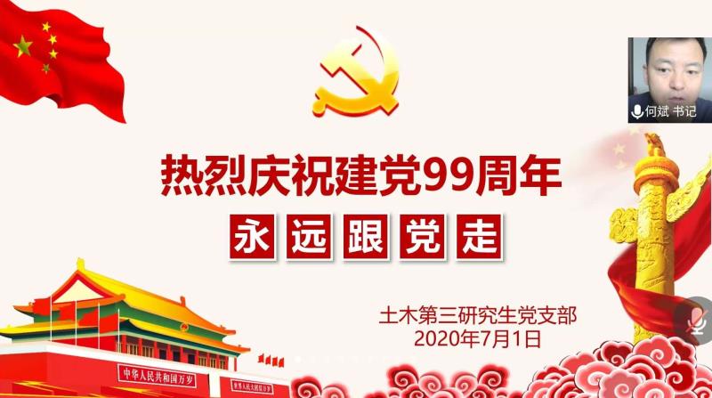 为庆祝中国共产党成立99周年,持续推进“两学一做”常态化教育,进一步增强广大学生党员在实践中守初心、担使命的思想,7月1日上午,土木第三研究生党支部开展“庆祝建党99周年”主题党日活动。活动分为支部书记讲党课、学习习近平总书记给复旦大学青年师生党员回信精神、抗疫先进个人事迹分享、手写祝福为党祝福等四个环节。支部25位党员通过“腾讯会议”在线上参加了活动。