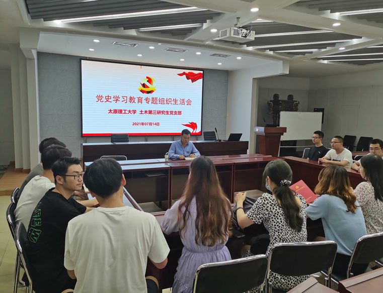为深入贯彻落实党史学习教育,引导广大党员学史明理、学史增信、学史崇德、学史力行,推动党史学习教育进一步落实落细,土木第三研究生党支部于2021年7月14日在土木馆五层会议室召开党史学习教育专题组织生活会,会议由支部书记何斌主持。