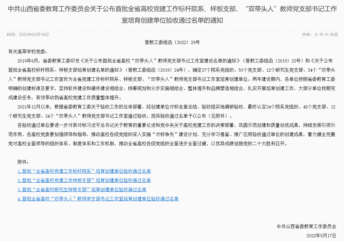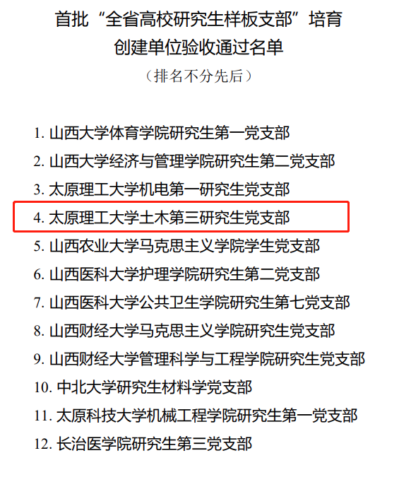 近日,山西省委教育工委公布了首批全省高校党建工作标杆院系、样板支部、“双带头人"教师党支部书记工作室培育创建单位验收通过名单。77779193永利官网土木第三研究生党支部作为我校首批9个全省党建工作培育创建单位之一顺利通过验收。