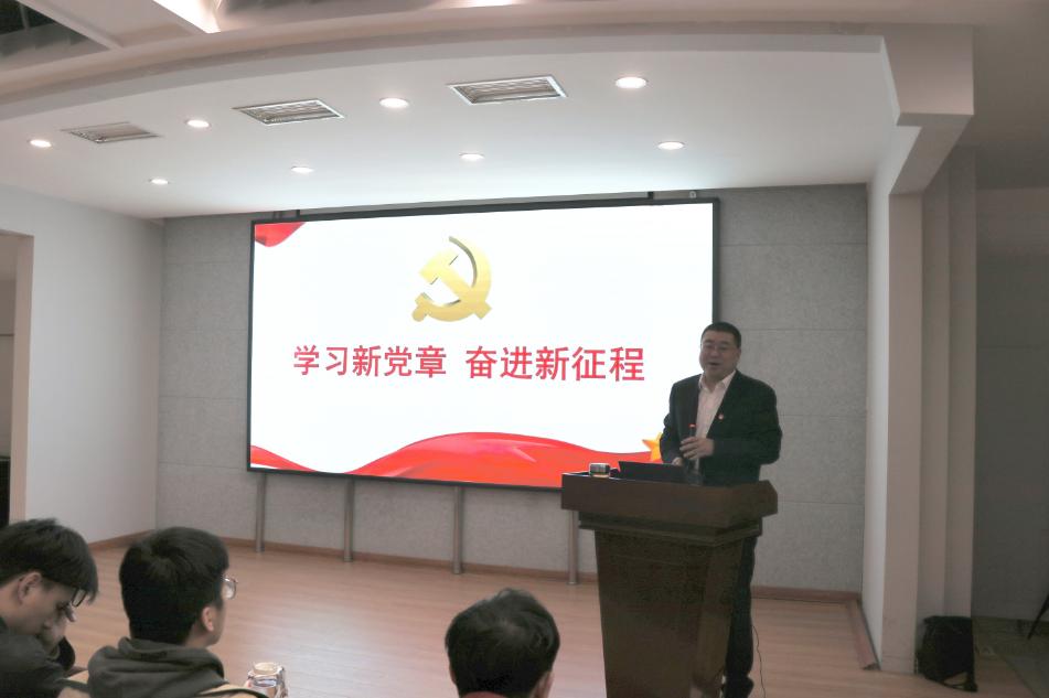 4月15日,在全校深入开展学习贯彻习近平新时代中国特色社会主义思想主题教育之际,院党委书记武佐君在迎西校区博学馆A座五层会议室以“学习新党章,奋进新征程”为题讲授专题党课。部分师生党员代表、入党积极分子参加。报告会由院党委副书记芦倩主持。