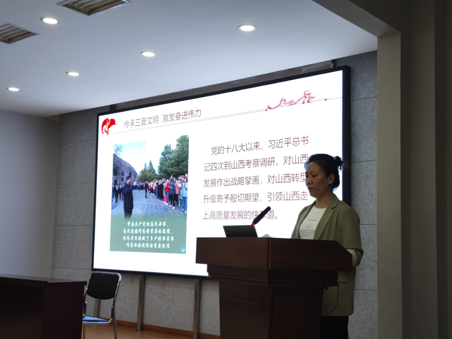 党课围绕党的十八大以来习近平总书记四次对山西省考察作出的重要指示,尤其是党的领袖对老区宏伟蓝图的战略擎画和对山西转型升级的殷切期望。芦倩针对当代青年大学生党员的特点,围绕山西历史文化特征与树立文化自信进行了讲授。