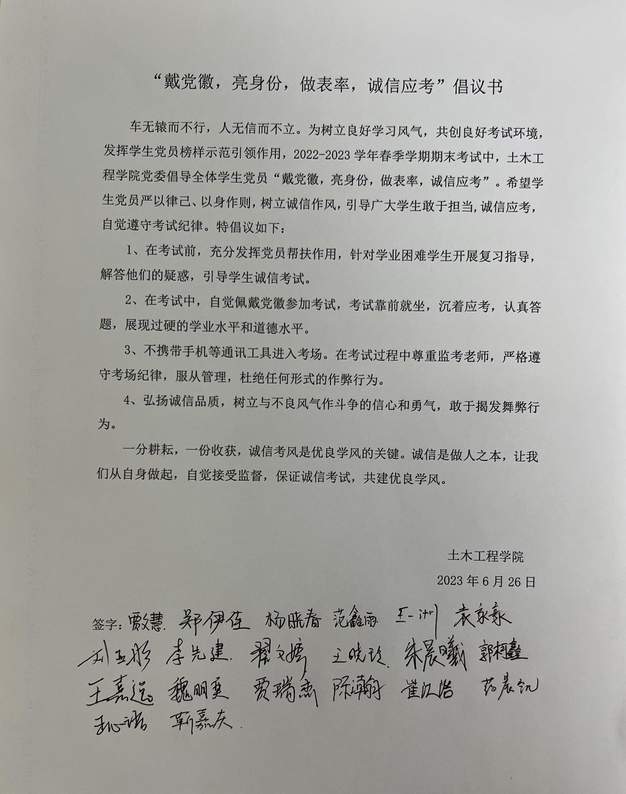 党员代表郑伊佳领读“戴党徽 亮身份 做表率 诚信应考”倡议书,与会全体学生党员共同签字承诺:考试期间佩戴党徽进入考场,严格遵守考试的规定和守则,自觉接受监考老师和同学的监督。