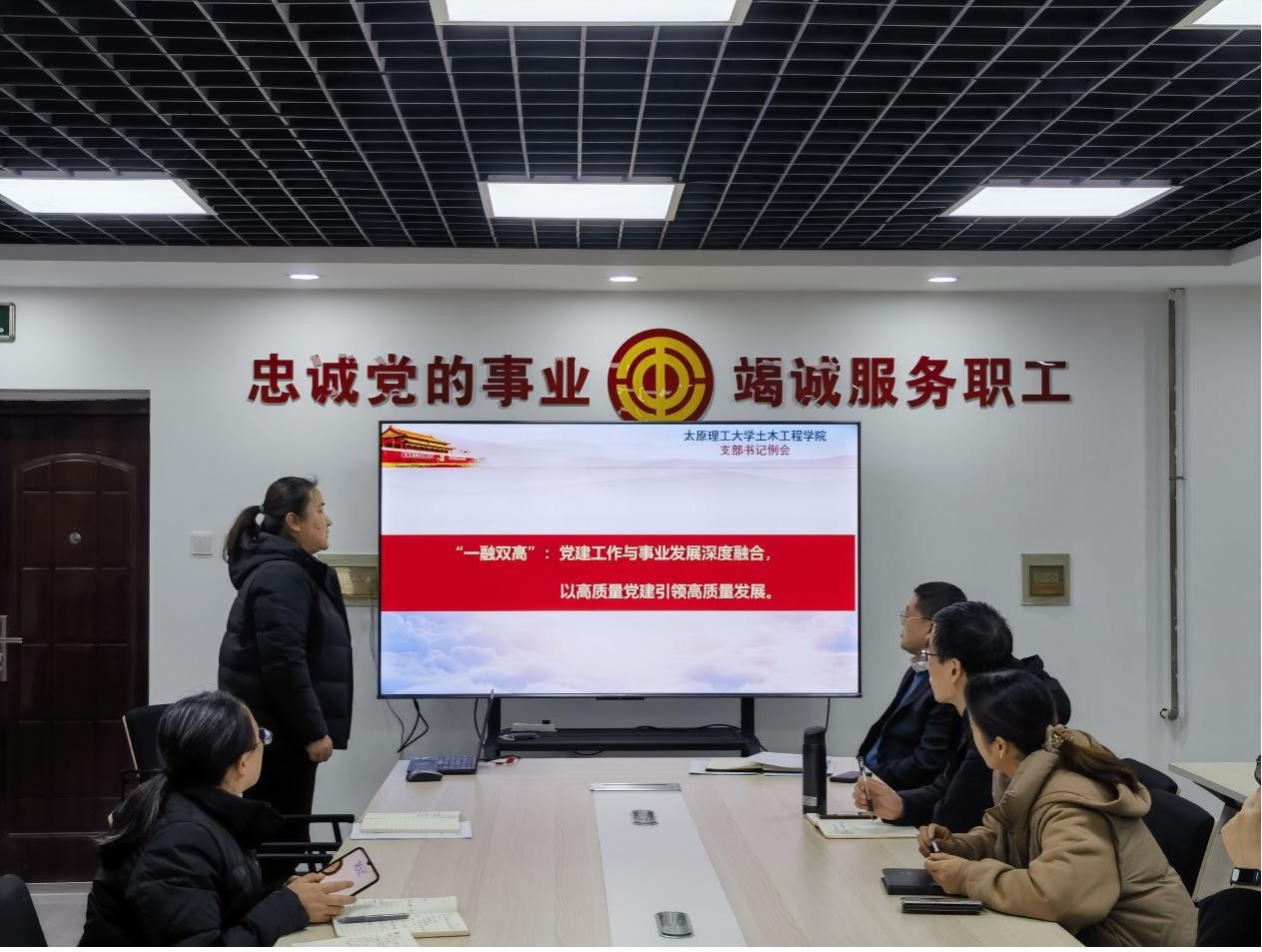 土木第三研究生党支部就党建双创开展了主题报告。与会人员对2024年本支部党建双创和党建研究工作的思路和举措进行了交流。组织员褚桂红就近期组织工作任务进行了安排。