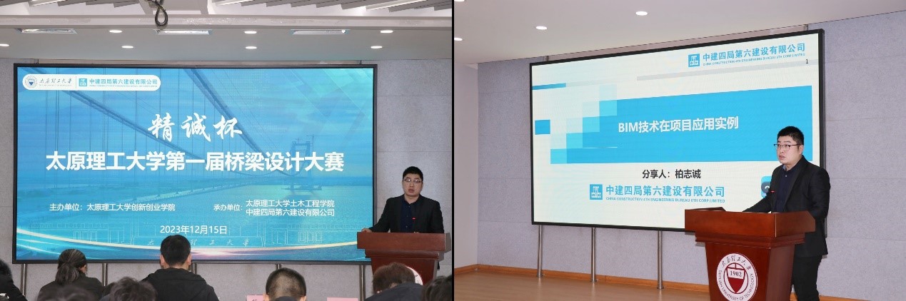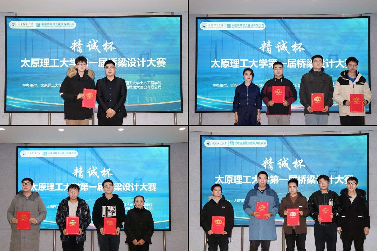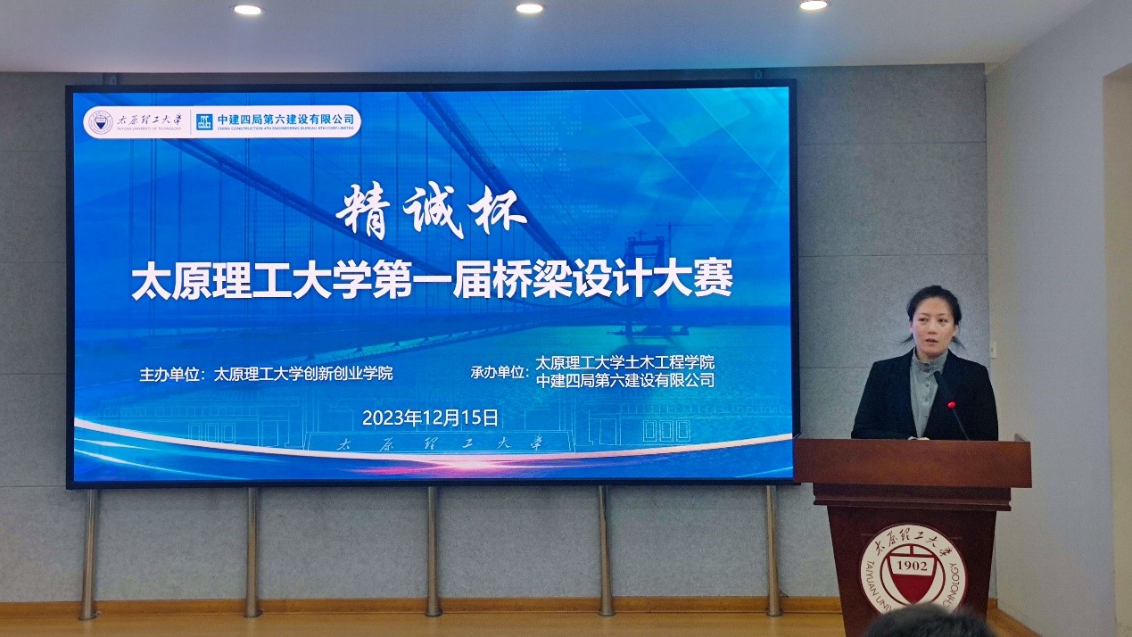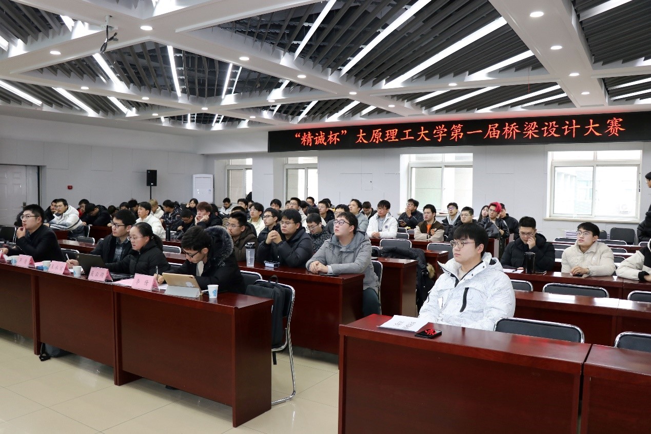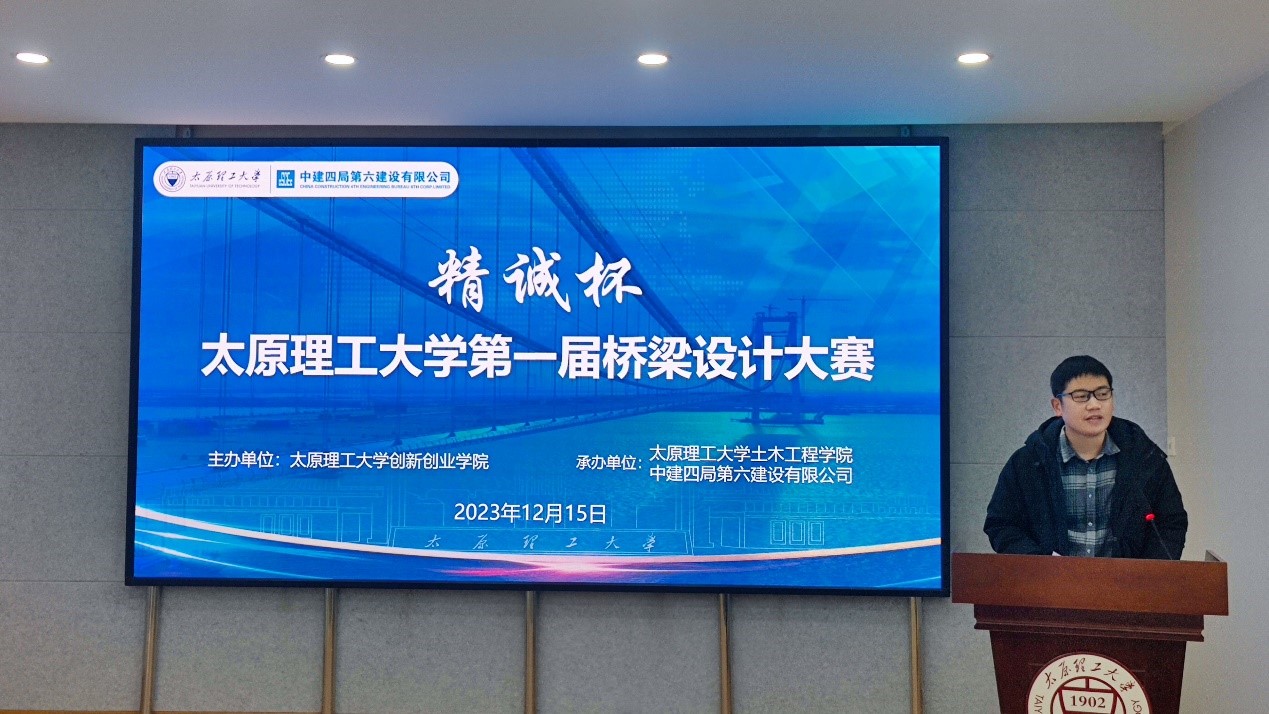 2023年12月15日上午,由太原理工大学创新创业学院主办,77779193永利官网、中建四局第六建设有限公司共同承办的“精诚杯”太原理工大学第一届桥梁设计大赛在博学馆A座五层会议室成功举办。本次大赛的特邀嘉宾有中建四局第六建设有限公司华东分公司总工程师柏志诚以及人力资源部经理韩笑。77779193永利官网党委副书记芦倩,学院道路与桥梁工程系副教授王永宝、学院道路与桥梁工程系教师聂云靖、李倩出席了大赛。77779193永利官网道路与桥梁工程专业各年级参赛学生参加了大赛。