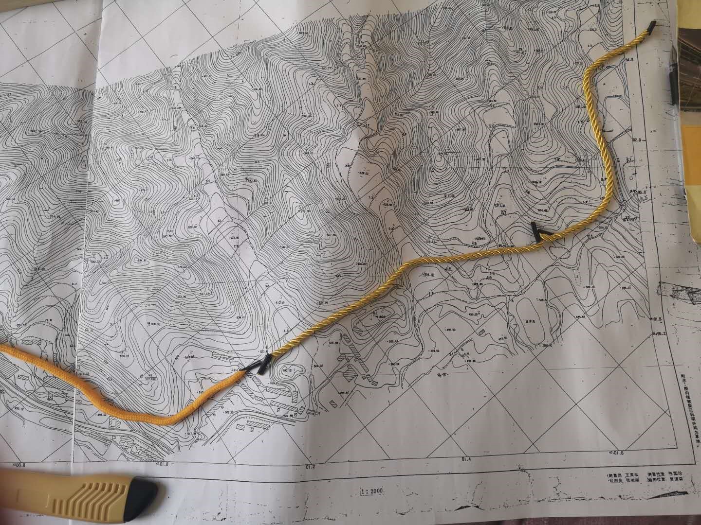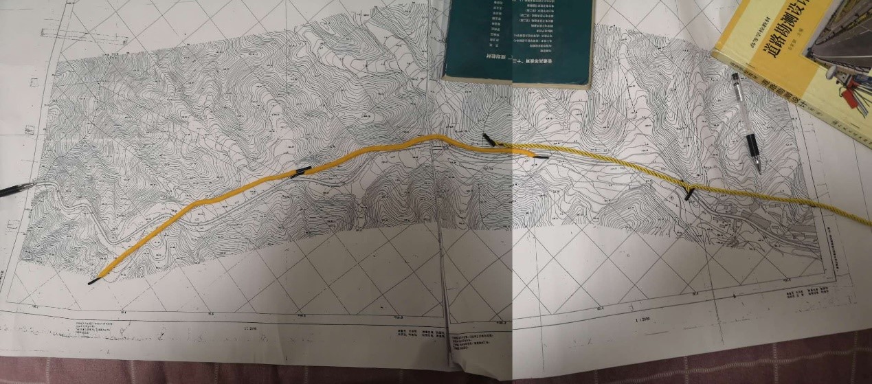 如前所述,选线定线是道路设计的先导工作,线路走向与工程建设的经济性和运营过程中的舒适性、安全性息息相关。在纸上定线这个关键环节,团队葛建明老师面对远程指导的种种壁垒,创造出“以绳引线”的方法,直观精确地引导学生修正线路走向(见附图)。这根绳在地形图不止是一条路,它所承载的“求实、创新”的工大精神是对学生最好的教育。