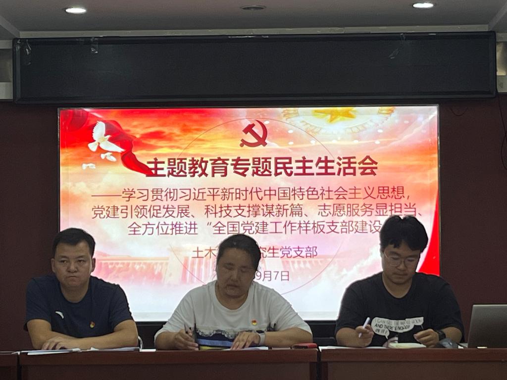 按照校党委和院党委的统一安排,根据中共太原理工大学委员会《关于在学习贯彻习近平新时代中国特色社会主义思想主题教育中开好专题民主生活会的通知》要求,9月7日下午,土木第三研究生党支部召开以“学习贯彻习近平新时代中国特色社会主义思想,党建引领促发展、科技支撑谋新篇、志愿服务显担当、全方位推进‘全国党建工作样板支部’建设”的专题民主生活会。会议由支部书记何斌主持,支部副书记马富丽及全体党员同志参加。