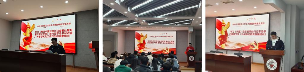 随后,支部书记邱斌、宣传委员王浩宇、组织委员李赟分别领学了“推进中国式现代化需要处理好若干重大关系和习近平总书记对宣传思想文化工作作出的重要指示”、“习近平总书记在庆祝中华人民共和国成立74周年招待会上的重要讲话”、“扎实推动教育强国建设”,支部党员就此进行了学习讨论。