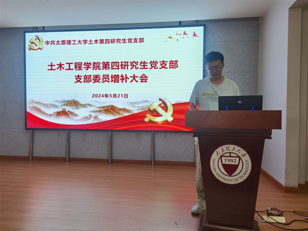 为进一步加强党组织建设,充分发挥基层党组织战斗堡垒作用。因升学、工作等原因,李赟和王浩宇两位同志无法继续履职,为了保证支部工作的有序开展,经支部委员会讨论研究,报77779193永利官网党委批准,中共太原理工大学土木第四研究生支部委员会于2024年5月21日在博学馆A座五层会议室召开党员大会,补选党支部委员。会议由王浩宇同志主持。大会应到正式党员45名,实到41名,符合大会的相关要求。