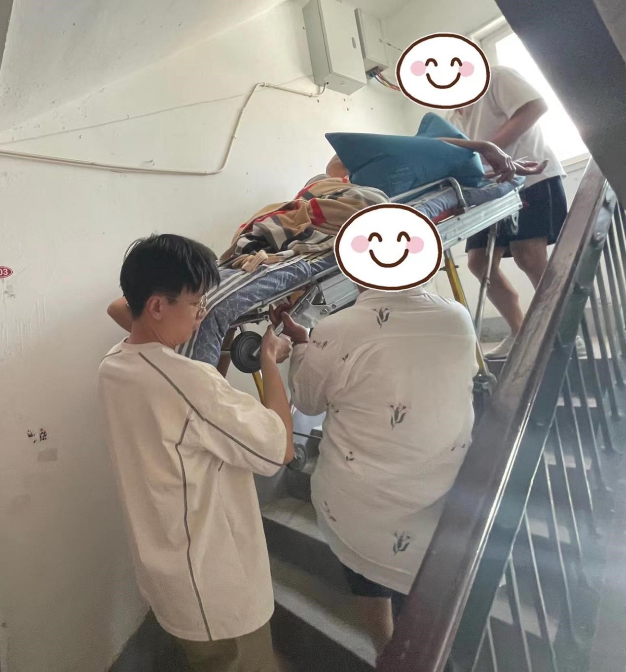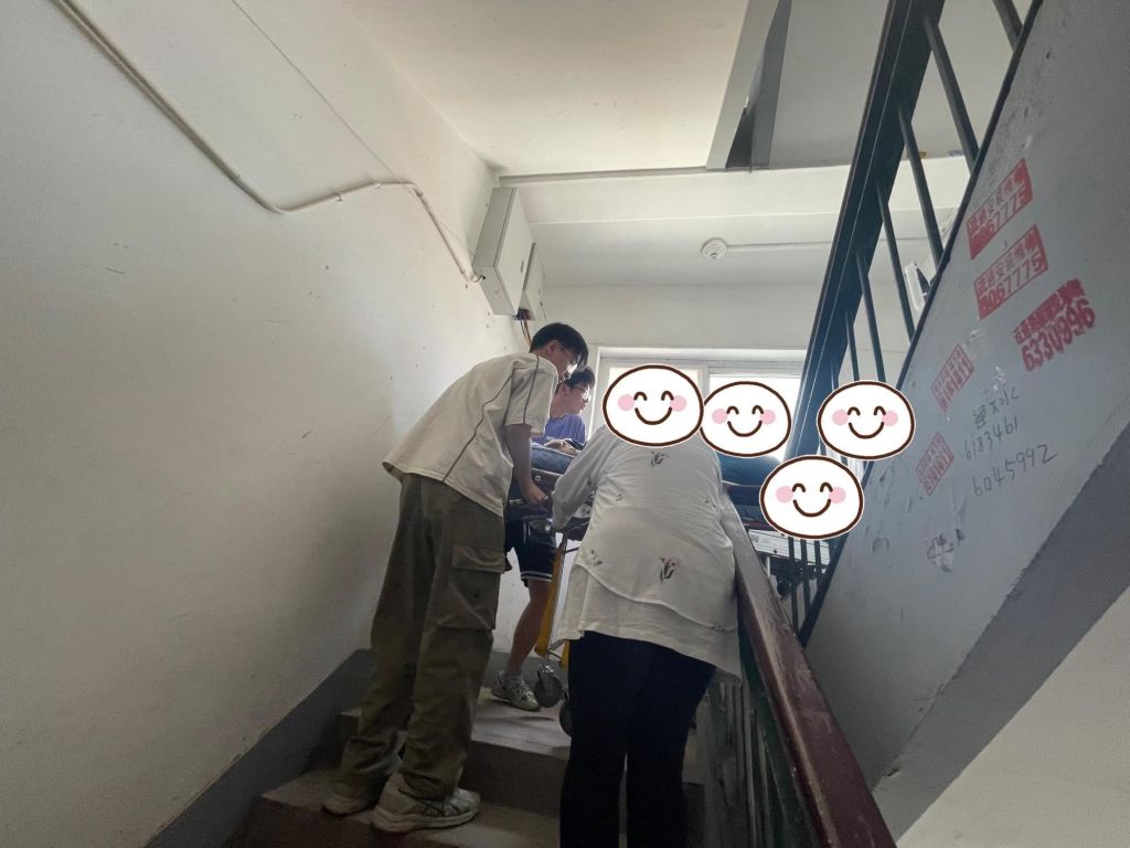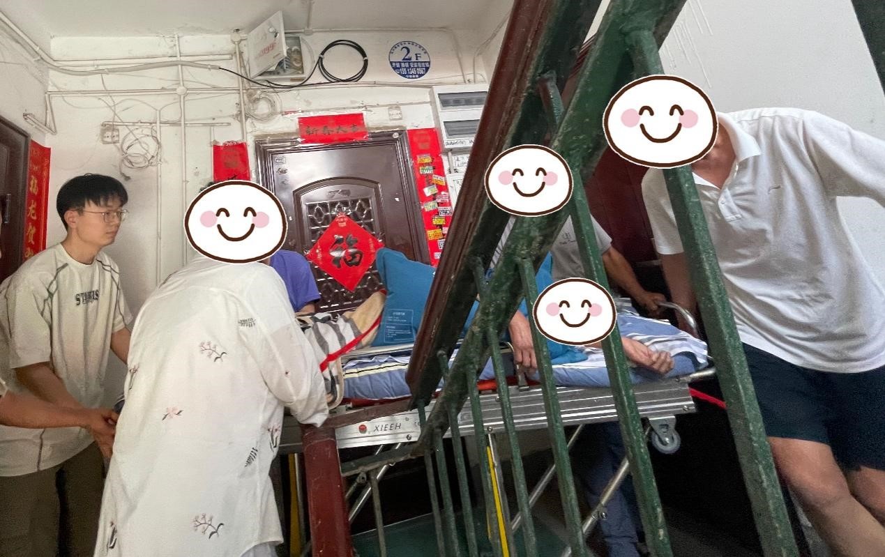 2024年6月13日中午11点半,土木第一研究生党支部书记柳丽接到一名太原理工大学教职工的求助信息,对方称其居住在太原理工大学西院住宅小区无电梯的住宅楼4楼,其家属中午12点将从医院治疗出院归来,但由于行动不便依旧卧于担架车上,而其他男性亲友有事无法前来,该名教职工及女性家属将出院家属抬上楼存在困难,所以希望能得到志愿者的帮助。柳丽同志在了解具体情况后,随即号召支部张鹏昆、曹培格、岳中华、张凯4名党员,积极承担抬担架助群众回家的“伸出援手,照亮他人”志愿服务,大家没来得及吃午饭便前往太原理工大学西院住宅小区进行帮忙。
