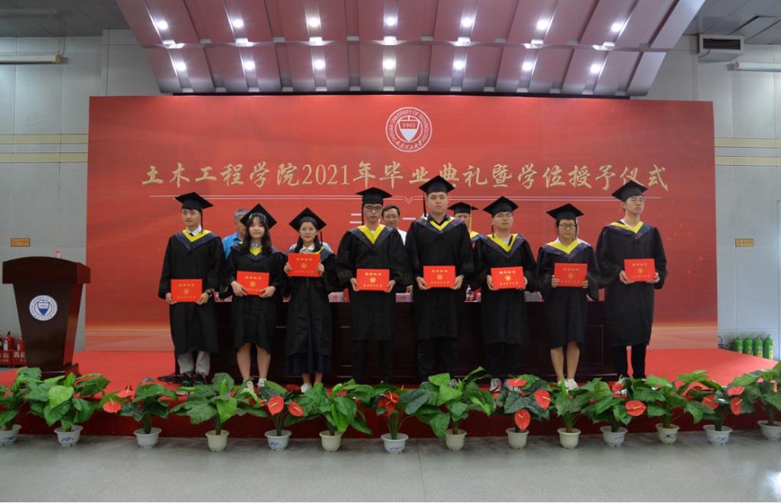 The graduation ceremony kicked off with the inspiring national anthem of the People's Republic of China. Afterwards, Zhou Wei announced the list of 2021 outstanding graduats of the College of Civil Engineering and presented awards to them. Ge Xinsheng informed the employment situation of our 2021 graduates. Du Zhenyu announced the results of the 2021 undergraduate graduation project (thesis) selection.