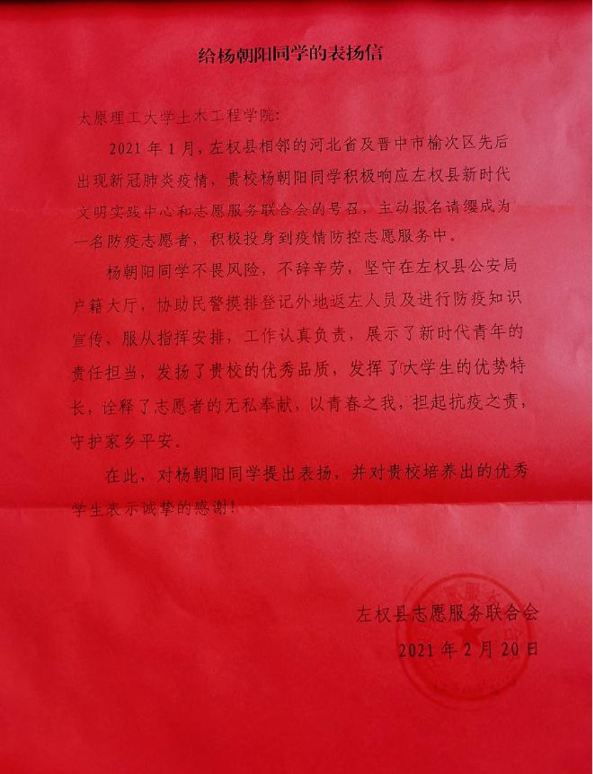 On May 14, the College of civil engineering received a letter of thanks from the Voluntary Service Federation of Zuoquan county. The Voluntary Service Federation expressed sincere thanks to Yang Chaoyang, a student of 1903 class majoring in civil engineering of the college. In January 2021, when the COVID-19 occurred in Hebei Province and Yuci District, Jinzhong City, Yang volunteered to become a volunteer of epidemic prevention and control in Zuoquan county and actively participated in the volunteer service of epidemic prevention and control during the epidemic period.