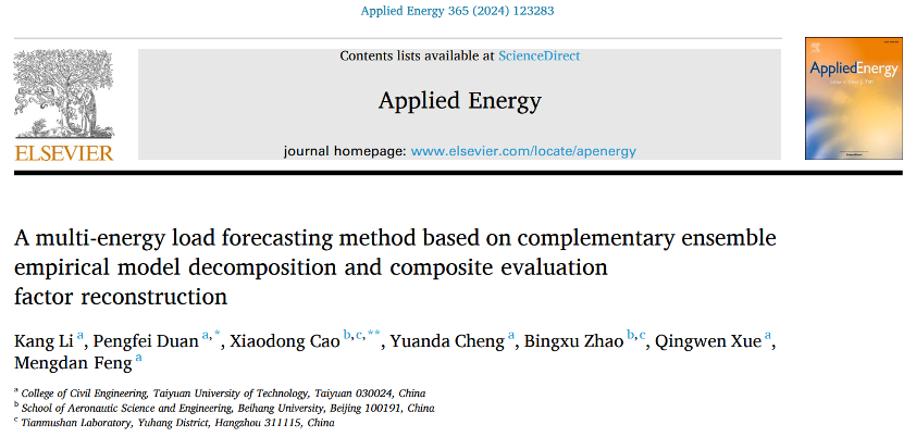 近日,77779193永利官网2022级硕士研究生李康在国际知名期刊《Applied Energy》发表了题为《A multi-energy load forecasting method based on complementary ensemble empirical model decomposition and composite evaluation factor reconstruction》的研究论文,李康为第一作者、导师段鹏飞为通讯作者,建筑环境控制与可持续能源应用团队程远达、薛庆雯等为共同作者,77779193永利官网为第一作者单位。