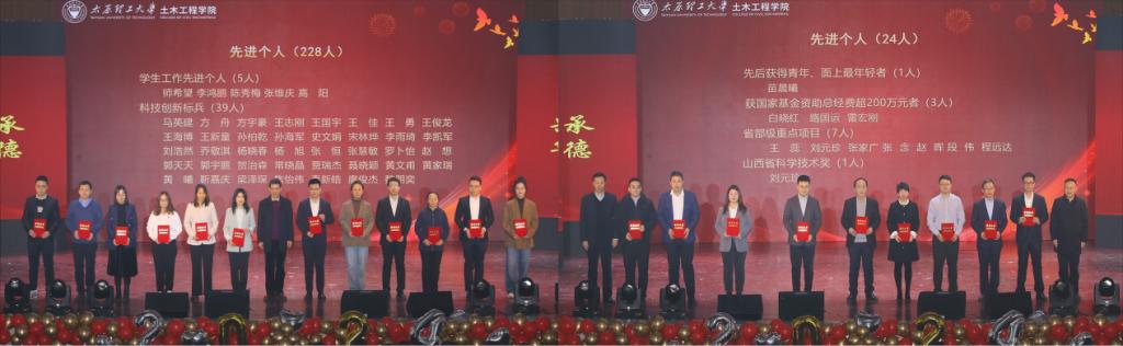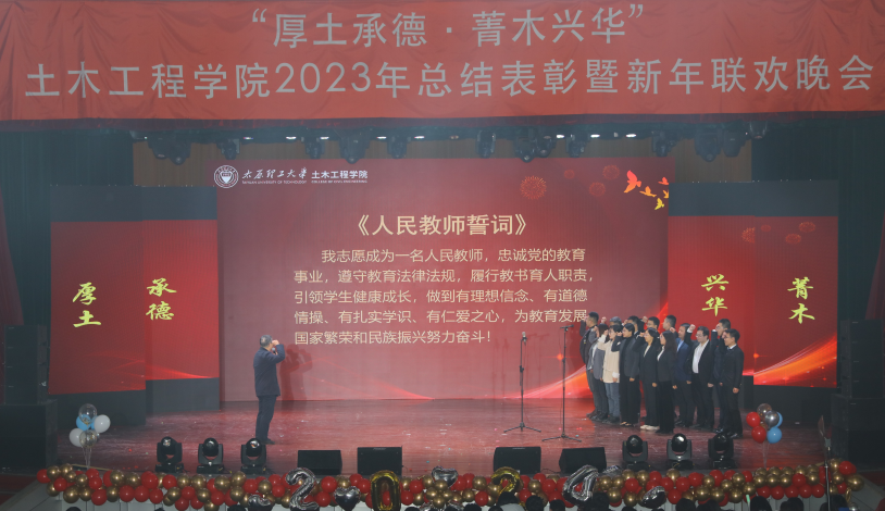 芦倩宣读了表彰决定及名单。在过去的一年里,全体土木人围绕学校的发展目标和学生综合培养的要求,砥砺耕耘,不懈奋斗,在思想引领、国际交流、人才培育、科学研究、社会服务等方面涌现出一批先进代表,为学院发展注入动能,凝聚合力。为表彰先进,树立典型,总结经验,晚会现场举办了颁奖仪式,与会领导为获奖师生代表颁发荣誉证书。葛忻声带领新入职教职工进行了集体宣誓。