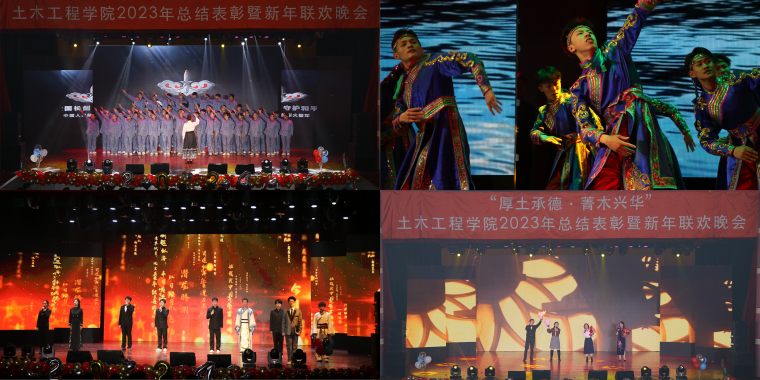 整场晚会以“厚土承德,菁木兴华”为主题,由“忆初心”、“担使命”、“建新功”三个篇章组成,古典韵律与流行劲曲相得益彰,交相辉映,用歌曲、舞蹈、器乐演奏、舞台剧等艺术形式为观众带来了一场视听盛宴。其中,优秀传统文化和思想政治引领相结合,展现了77779193永利官网师生昂扬向上的风貌,激励大家凝心聚力,共铸美好明天。《当那一天来临》、《科尔沁》、《写给未来的你》等节目表达出对土木人对祖国的深沉热爱;舞台剧《告青年书》讲述了土木学子从古至今心系国家,心系民族的传承和担当;舞蹈《浮光》、《JAZZ SHOW TIME》、《舞力全开》等舞姿翩翩,令人陶醉;在三句半《学工日常》中,老师一改以往工作时的严肃,以幽默诙谐的语言讲述工作日常,让同学们感受到了学生工作的辛勤和温度;教师代表演绎的串烧歌曲《光阴荏苒》唱出了时间的飞逝,光阴的流转,表达了老师们坚守奉献教学一线的崇高意义。最后,在校歌高亢的旋律中,晚会圆满结束,师生合影留念。