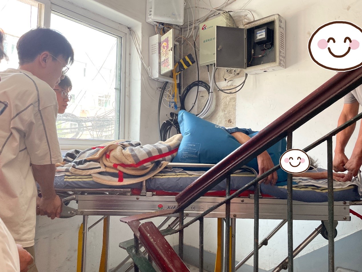 2024年6月13日中午11点半,土木第一研究生党支部书记柳丽接到一名太原理工大学教职工的求助信息,对方称其居住在太原理工大学西院住宅小区无电梯的住宅楼4楼,其家属中午12点将从医院治疗出院归来,但由于行动不便依旧卧于担架车上,而其他男性亲友有事无法前来,该名教职工及女性家属将出院家属抬上楼存在困难,所以希望能得到志愿者的帮助。柳丽同志在了解具体情况后,随即号召支部张鹏昆、曹培格、岳中华、张凯4名党员,积极承担抬担架助群众回家的“伸出援手,照亮他人”志愿服务,大家没来得及吃午饭便前往太原理工大学西院住宅小区进行帮忙。