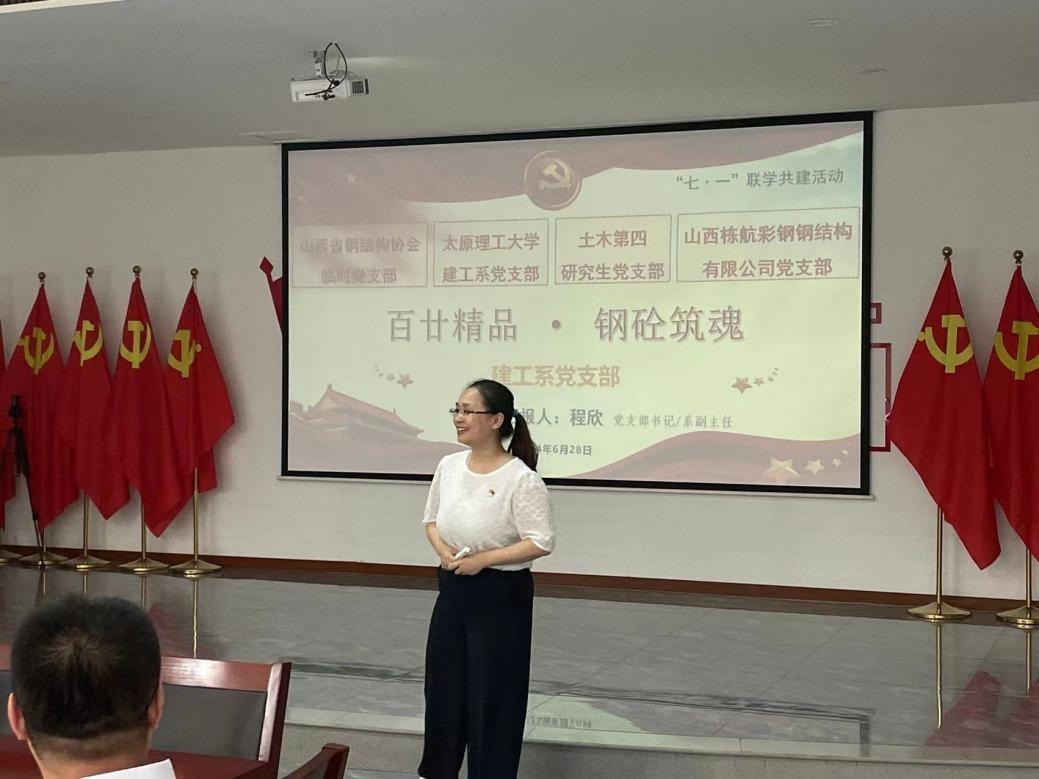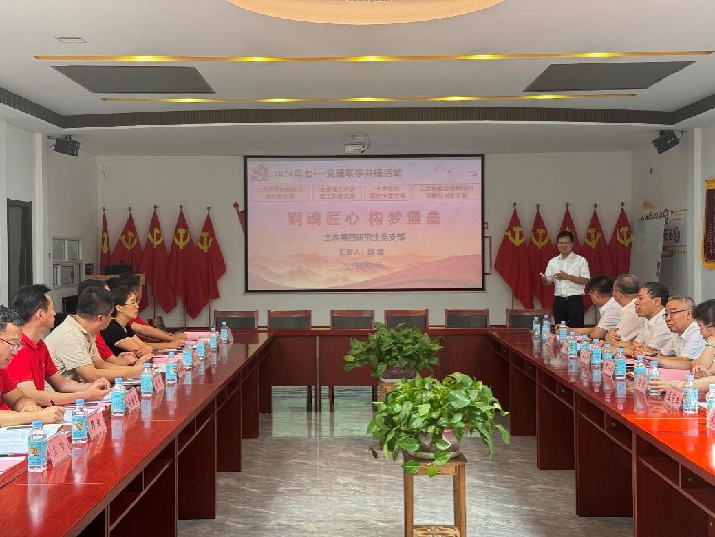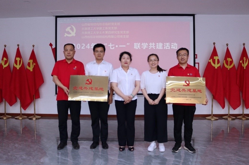 为庆祝中国共产党成立103周年,进一步深入学习贯彻落实习近平新时代中国特色社会主义思想及党的二十大精神,全面推进基层党组织建设,积极探索“党建+业务”深度融合模式,构建“党建引领、校企合作、发展共赢”的党建新格局。2024年6月28日上午,太原理工大学建工系党支部联同土木第四研究生党支部、山西省钢结构协会临时党支部和山西栋航彩钢钢结构有限公司,共同举办了七一党建共建活动,并举行了党建共建基地的揭牌仪式。参加此次活动的主要人员有:山西省钢结构协会临时党支部书记沈沛鸿、会长李海旺、秘书长兼支部副书记石彦卿、常务副会长张波、副秘书长李卫文,太原理工大学建工系党支部书记程欣、副书记孟宪杰、党小组组长刘瀚超,土木第四研究生党支部书记邱斌及山西栋航彩钢钢结构有限公司董事长王国栋、总经理闫峰、总工程师朱学强、业务总监霍永结、生产总监王飞、财务总监曹彩庆、党支部书记张继良等。